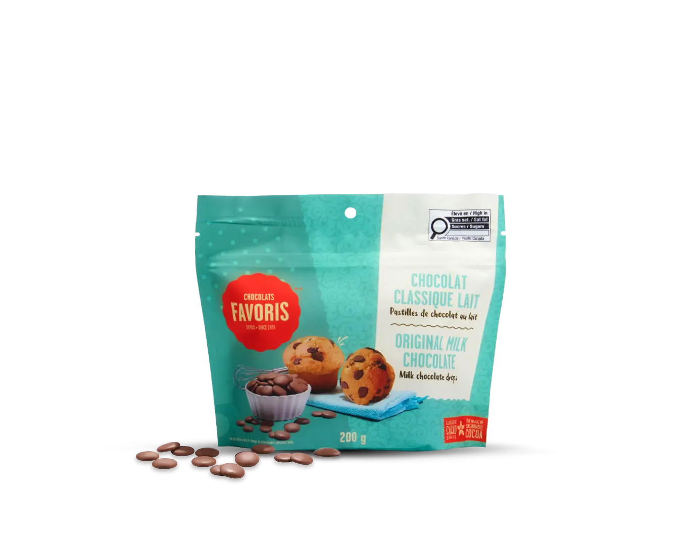 Du vrac en sac! Oui, nos pastilles de chocolat sont vendues en sac dans vos saveurs favorites : Classique lait, Classique noir, classique blanc et Dulce de leche. Ajoutez une touche de magie dans vos gâteaux et pâtisseries!