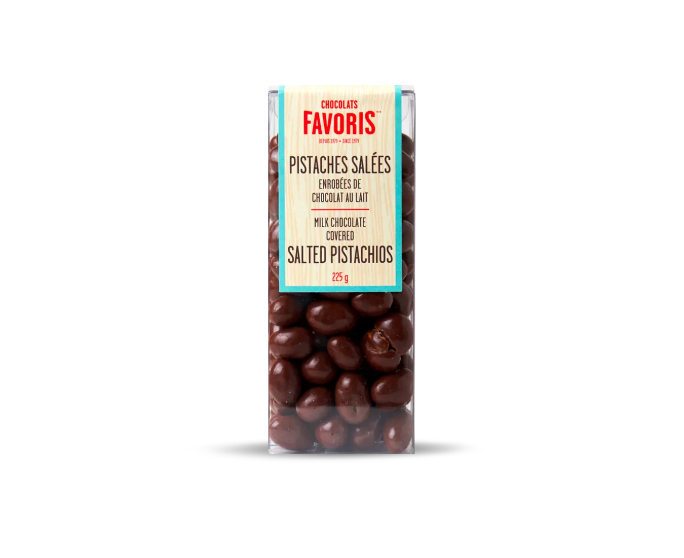 Découvrez nos pistaches salées et croquantes enrobées de chocolat au lait. Parfaites pour partager entre amis ou en famille et ce peut importe l'occasion!