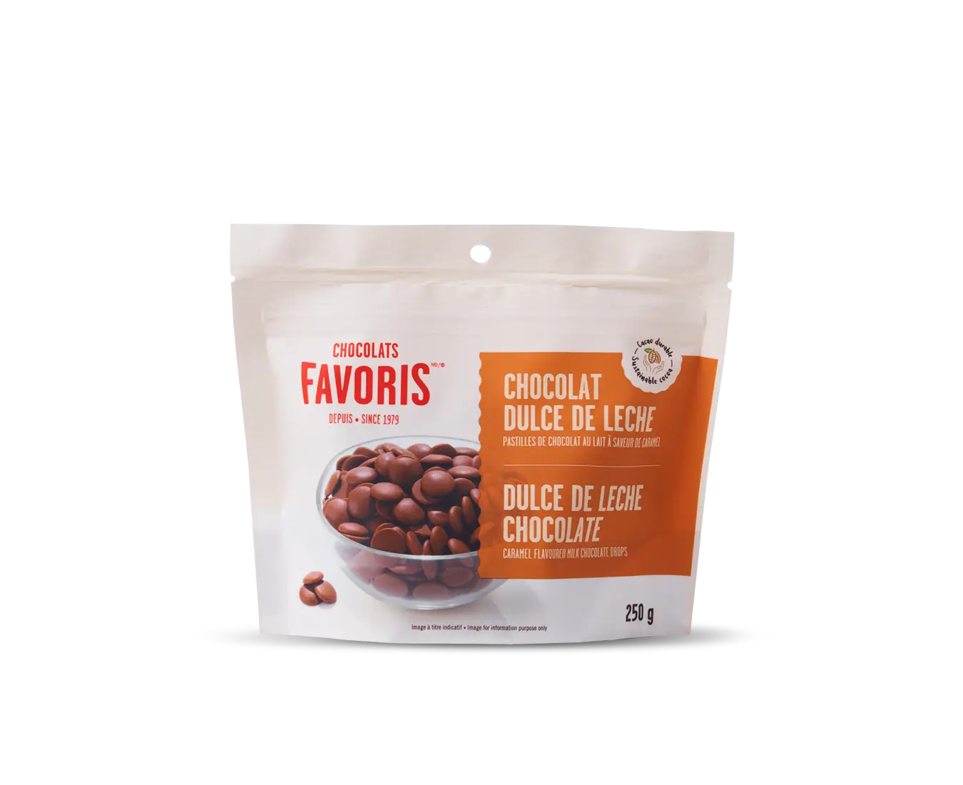 Du vrac en sac! Oui, nos pastilles de chocolat sont vendues en sac dans vos saveurs favorites : Classique lait, Classique noir, classique blanc et Dulce de leche. Ajoutez une touche de magie dans vos gâteaux et pâtisseries!