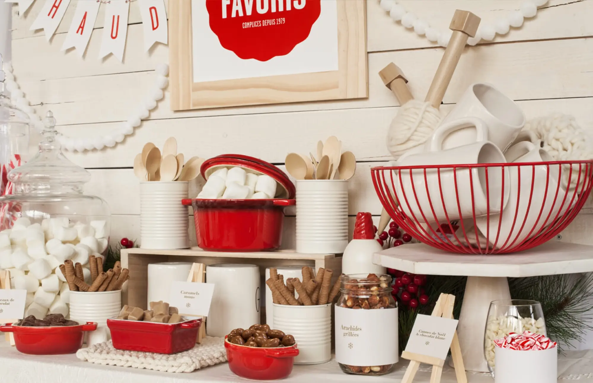 - Set up a table to serve as a hot chocolate bar in such a way as to showcase your toppings and your decorations.