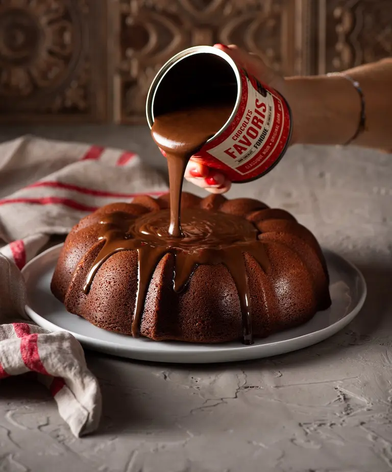 - In a second bowl, beat the granulated sugar with the egg, Greek yogurt, milk and vanilla. Pour half a can of fondue into the bowl and stir with a wooden spoon until smooth. Set aside the rest of the fondue and the second can in a double boiler pot or a small sauce-pan with hot water at the bottom to prevent them from setting.