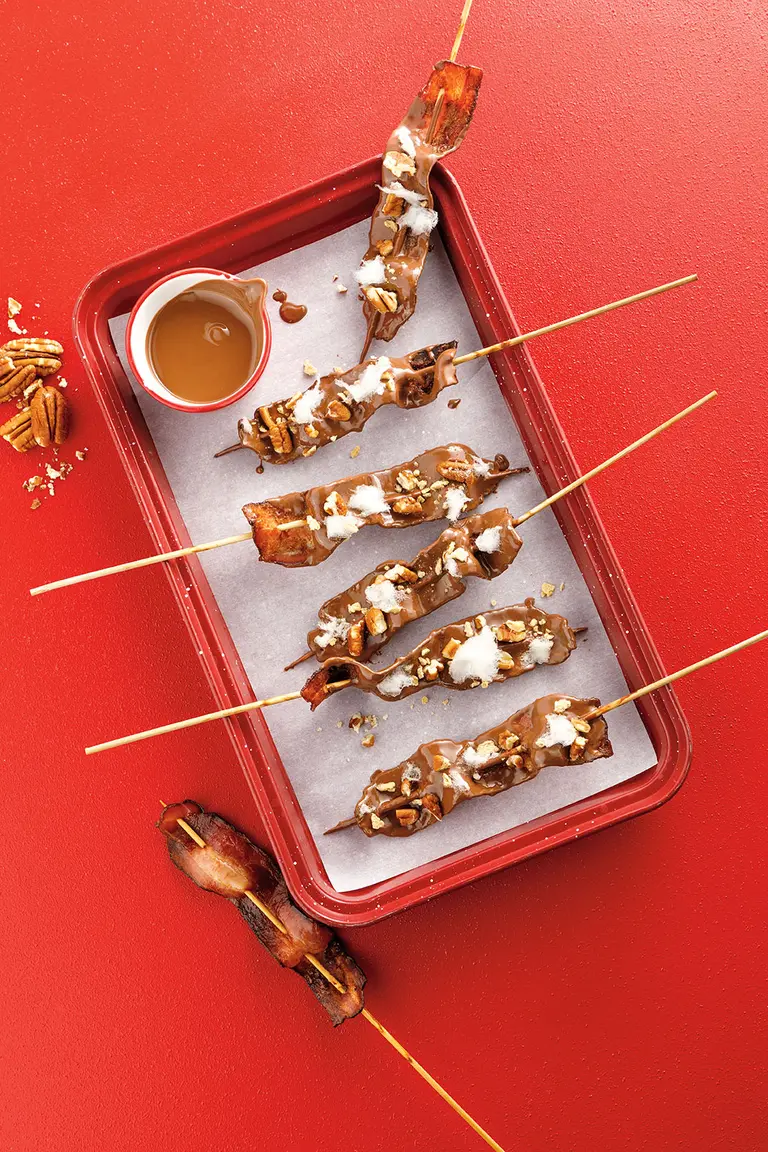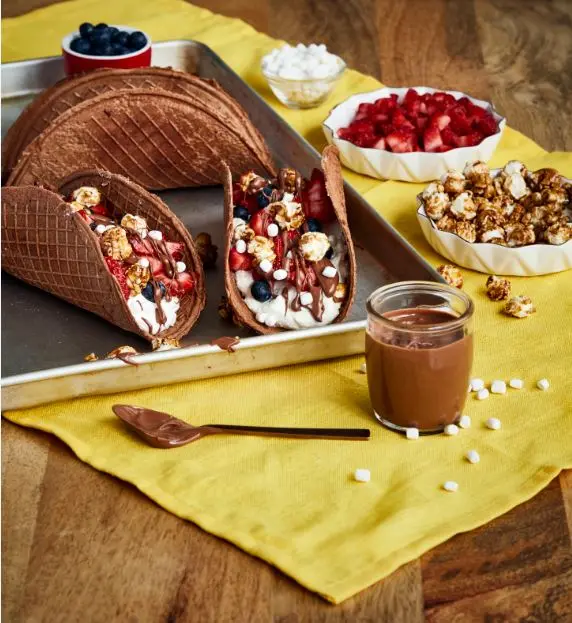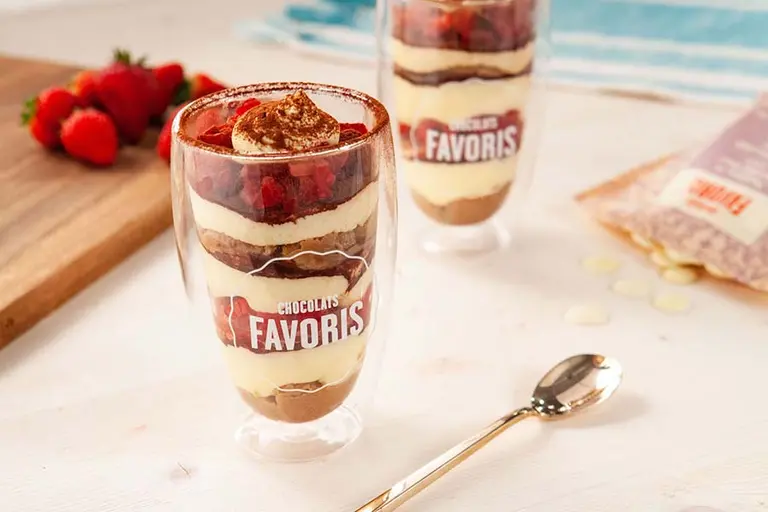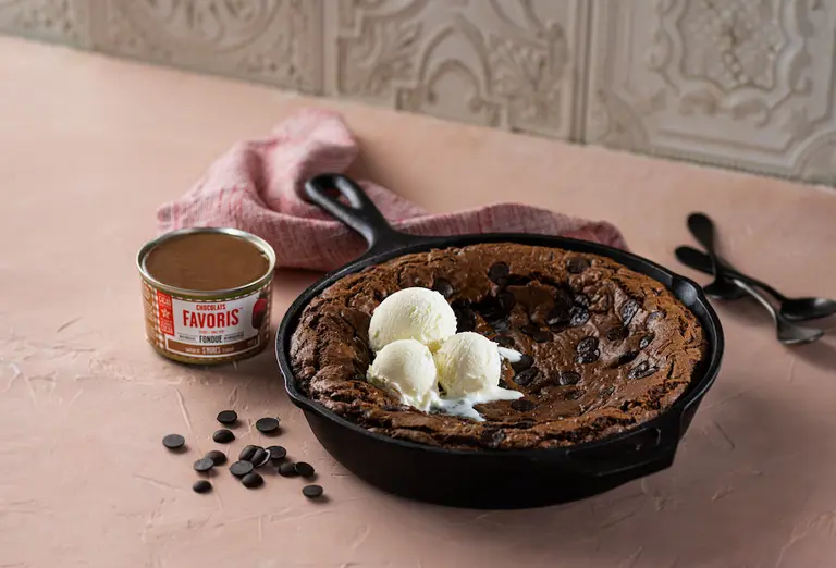 - Generously spread on the warm pizza dough with Chocolats Favoris fondue. Garnish with fresh strawberries, then drizzle the remaining fondue over the strawberries. Garnish with roasted hazelnuts and serve immediately.