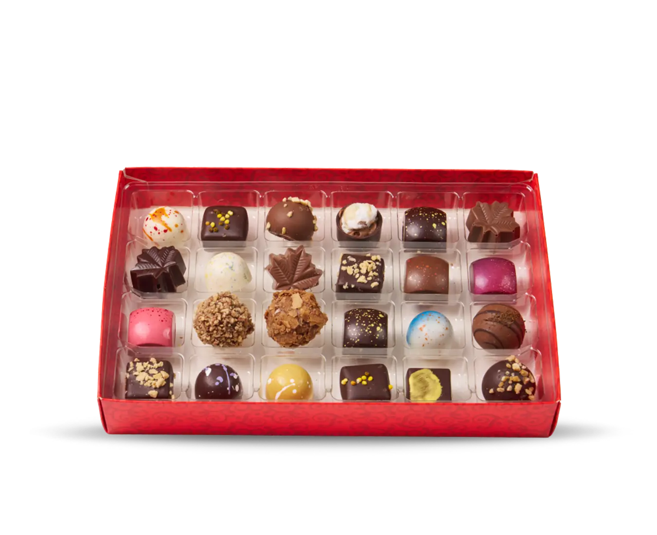 Nos maître chocolatiers ont concoctés à la main plus d'une trentaine de chocolats fins regroupés à travers différentes familles de saveurs. On vous présente nos plus grand succès en boîtes de 6, 12, 24 ou 48 morceaux. Note : afin de maximiser la saveur et de la fraîcheur de ces chocolats, assurez-vous de les conserver dans un endroit frais et sec entre 15 et 20° et de les consommer dans les 15 jours suivant l’achat. *Photos et saveurs à titre indicatif seulement. Le contenu de la boîte peut varier.